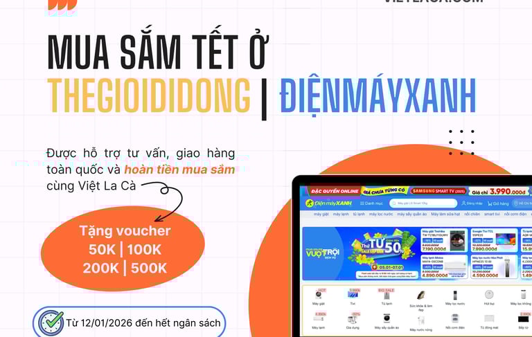 Độc quyền hoàn tiền mua sắm, tặng voucher từ 50K đến 500K khi mua sắm Tết tại hệ thống siêu thị Điện Máy Xanh và Thế Giới Di Động trên toàn quốc…
